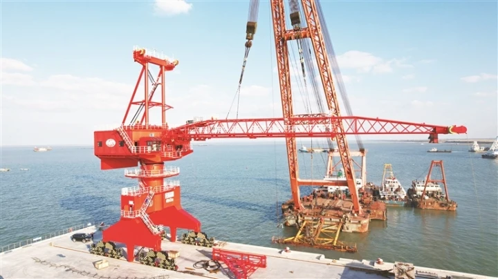 8日,南通港通州灣港區(qū)洋口作業(yè)區(qū)金牛碼頭W1#泊位首臺(tái)單臂架門座式起重機(jī)吊裝成功。本次門座式起重機(jī)安裝作業(yè),采用起重船起吊的作業(yè)方式。由運(yùn)輸船從南京裝載運(yùn)至泊位前沿水域,再通過浮吊船從運(yùn)輸船上吊至碼頭進(jìn)行安裝。