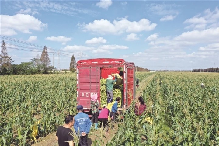 29日,江心沙農(nóng)場鮮食玉米喜迎豐收,工人們?cè)谔镩g采摘裝車,發(fā)往蘇南和上海市場。為了滿足市場需求,農(nóng)場進(jìn)行整體規(guī)劃布局和錯(cuò)峰種植,秋熟鮮食玉米采摘期將持續(xù)到11月中旬?! ?nbsp;