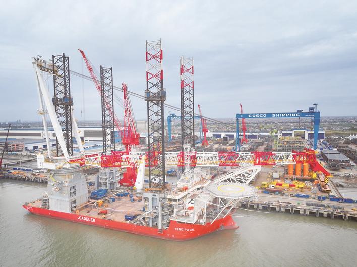 9日,啟東中遠海運海工為外國船東定制的NG20000型風(fēng)電安裝船2號船進入調(diào)試階段。該船一次可運輸并安裝7套完整的15MW或5套20MW以上的風(fēng)機,是目前全球技術(shù)規(guī)格最高、最先進和環(huán)保的自升式海上風(fēng)電安裝船。 記者 許叢軍攝